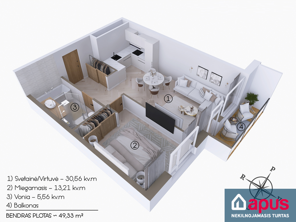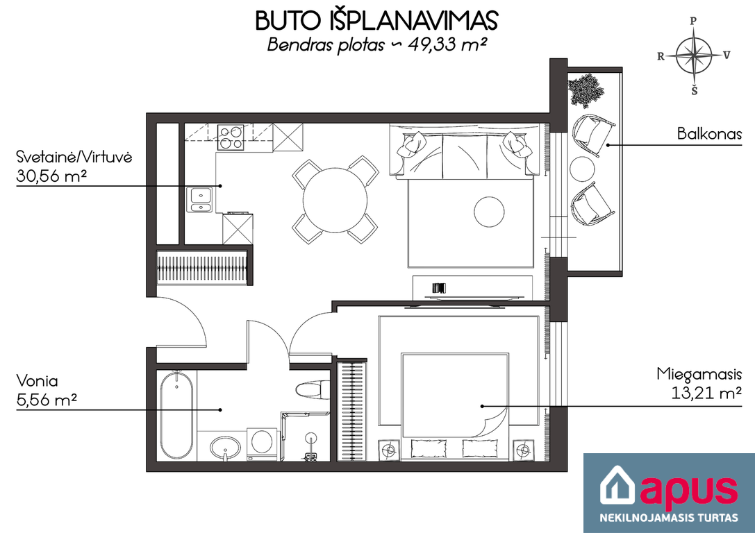 - bendras buto plotas 49,33 kv. m;