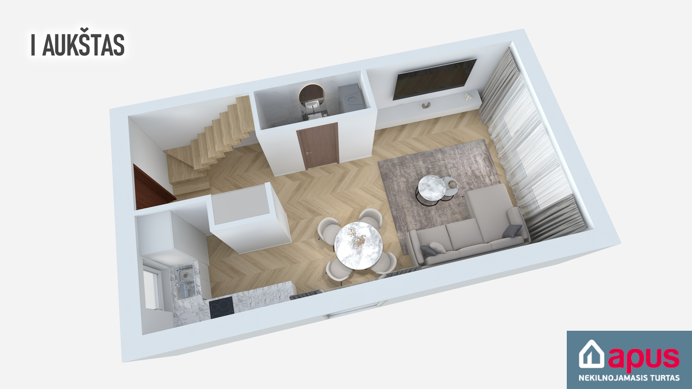 • 1 aukšte suplanuotas tambūras, virtuvė, valgomasis, svetainė ir san. mazgas.