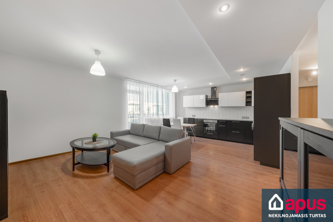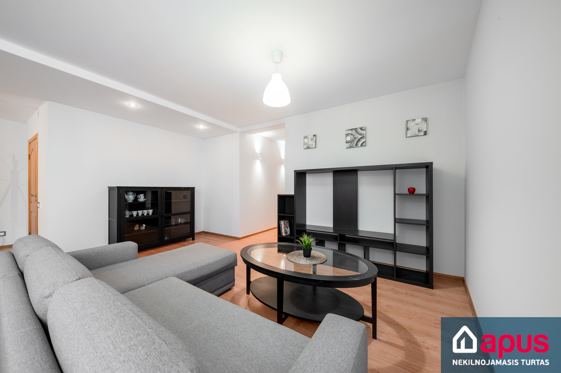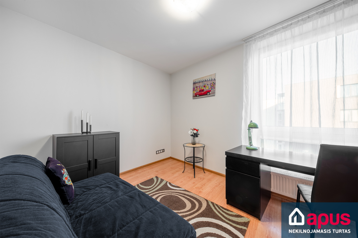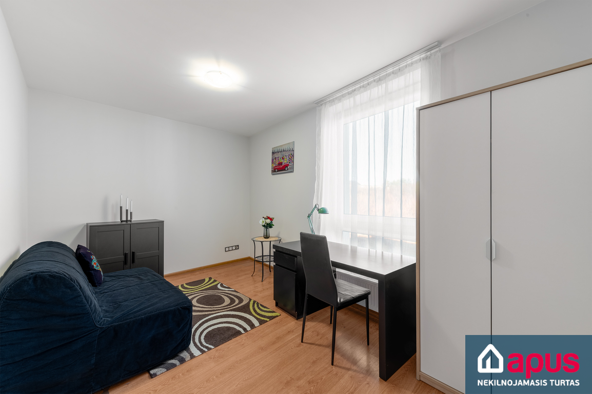 - svetainė sujungta su virtuve, du miegamieji;