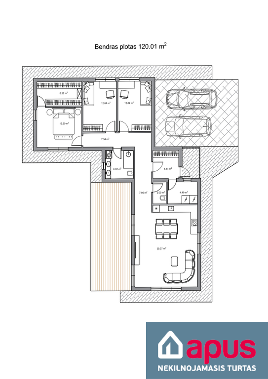 Vieno aukšto, 4 kambarių, 120 kv. m namas. Svetainė su valgomuoju ir virtuve (39 kv. m), 3 miegamieji kambariai (12,8-13,6 kv. m), du san. mazgai (6 ir 2 kv. m), katilinė, drabužinė.