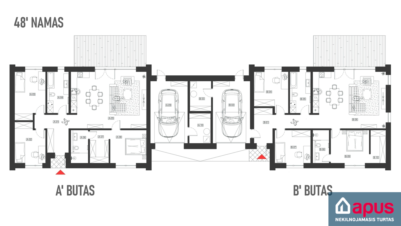 • Dvibučiai namai blokuoti garažais arba sandėliukais – neturi bendros sienos tarp kambarių.