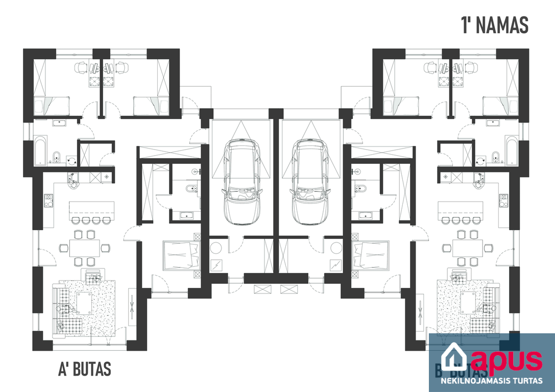 • Projektą sudaro 10 dvibučių gyvenamųjų namų su 20-čia garažais/sandėliukais sublokuotų butų.