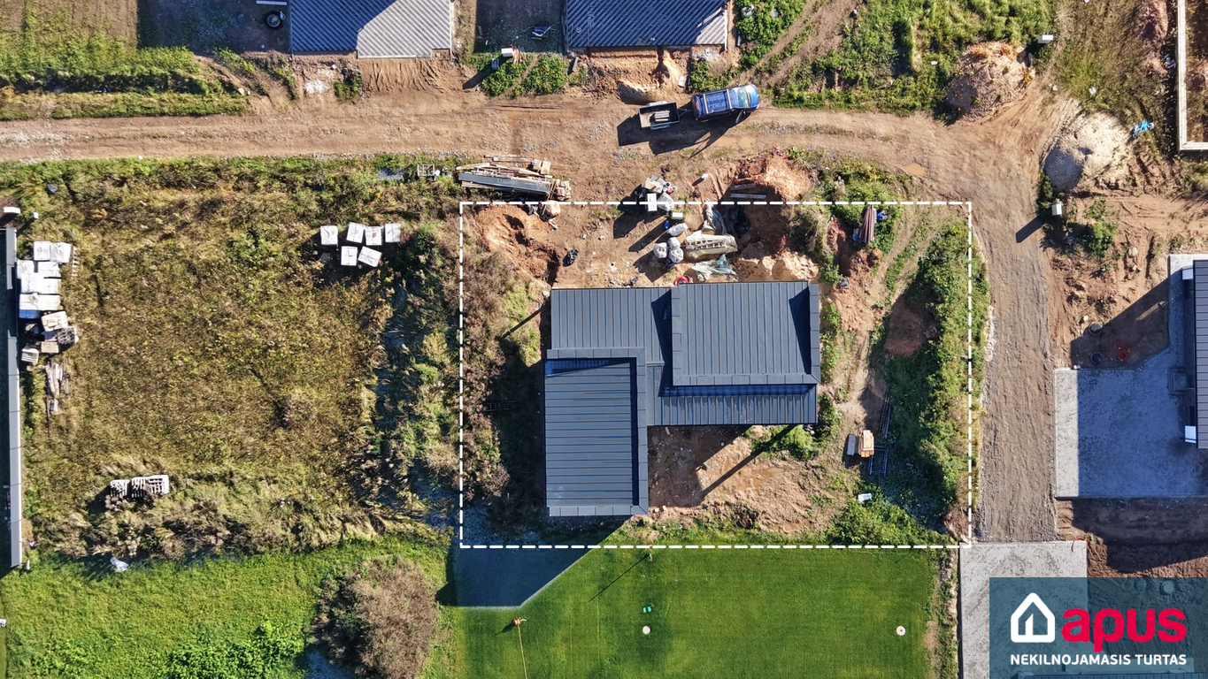 Pamatai gręžiniai poliniai, rostverkas apšiltinti putplasčiu (200 mm iš išorės, 100 mm iš vidaus, 100 mm iš apačios). Namo sienos - dujų silikato blokelių mūras (200 mm), apšiltintos 300 mm Neoporu. Fasado apdaila - dekoratyvinis tinkas. Stogas medinės konstrukcijos, apšiltintas poliuretano putomis + 10 mm akmens vata, stogo danga - klasikinė skarda. Vidinės pertvaros dvugubo gipsokartonio konstrukcijų su akmens vatos užpildu (75 mm, katilinė - 100 mm). Iki taškų išvedžiota elektros bei silpnųjų srovių instaliacija ir santechnika. Įrengtas grindinis šildymas, grindys išbetnuotos. Plastikiniai Rehau A++ klasės langai. Išvedžiota rekuperacinė vėdinimo sistema (rekuperatorius nemontuojamas).