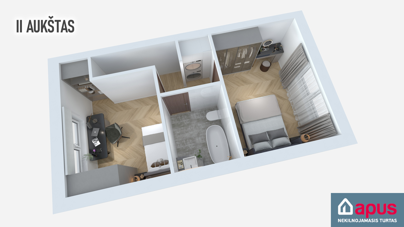 • 2 aukštai, 3 kambariai (2 miegamieji), 2 san. mazgai.