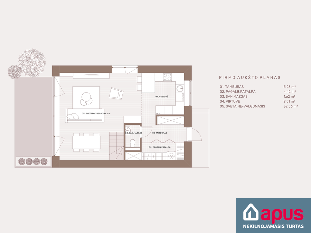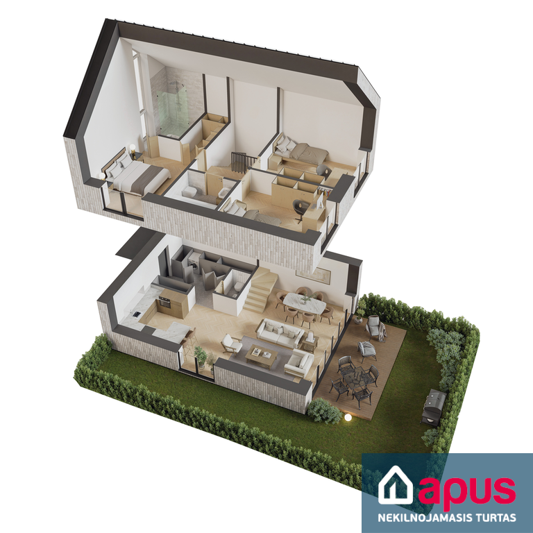 • Erdvi svetainė su virtuve pirmame aukšte ir 3 miegamieji antrame aukšte.